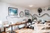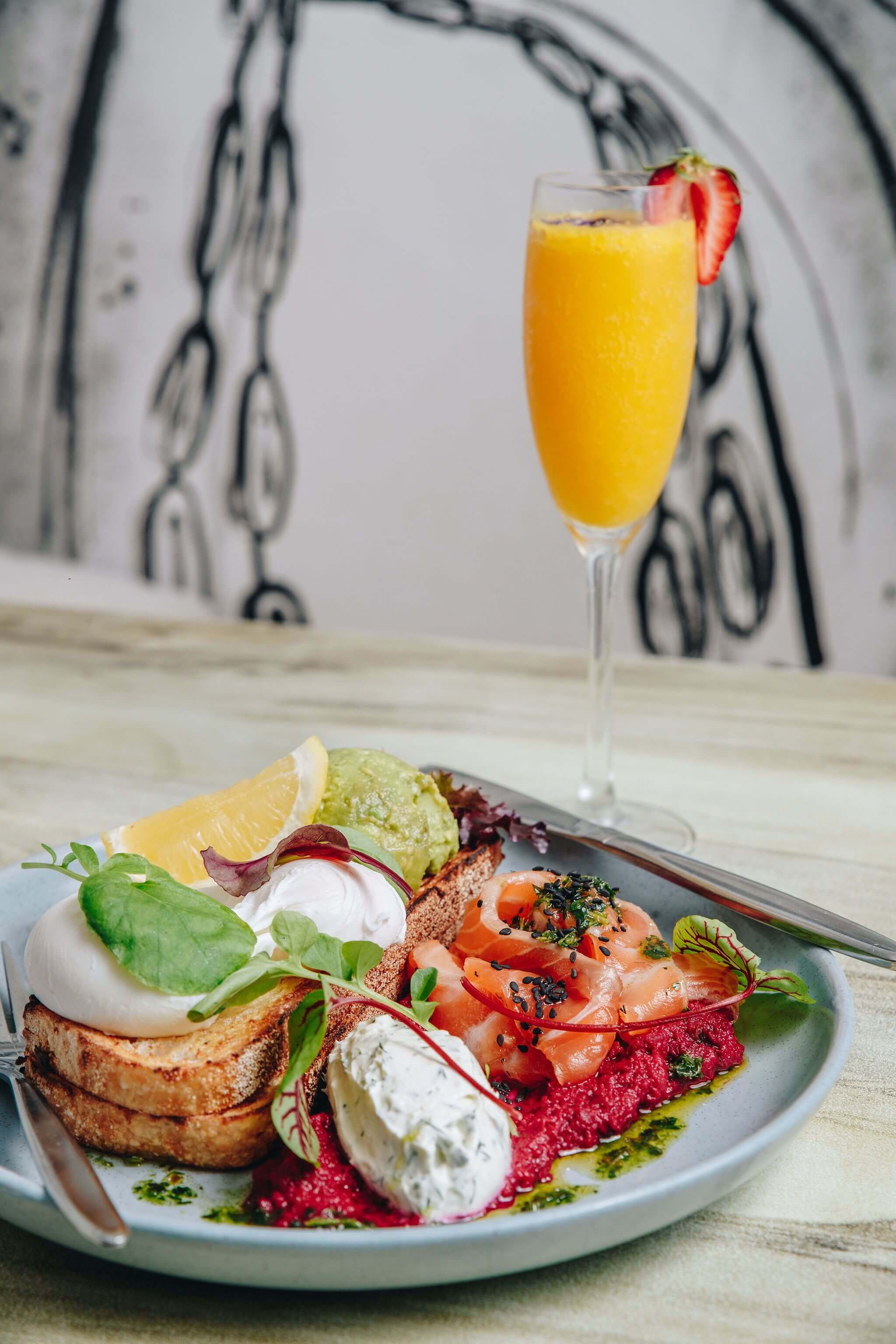The café has ample street side seating where customers can even sight dolphins and whales playing in the ocean. Inside the cafe there are also large wall murals by local artist Grant Molony.